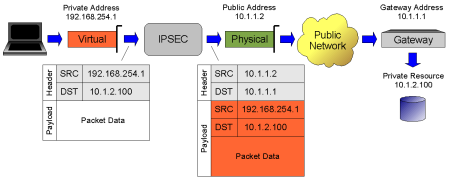 When operating in Virtual Adapter Mode, the VPN Client creates a virtual adapter to use with IPsec communications. Local route management is used to ensure that packets destined to the remote private network will be sourced from the virtual adapter.