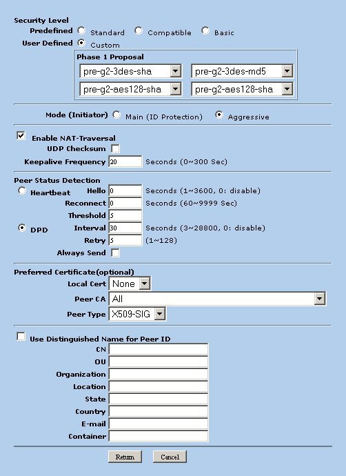 Create an auto key advanced gateway to configure the phase1 parameters. Navigate to the following screen using the tree pane on the left hand side of the browser interface.