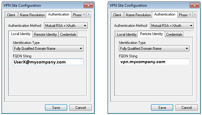 - Important here it that you select 'IKE User' - 'Simple Identity' and place 'UserX@mycompany.com' into the 'IKE Identity' field